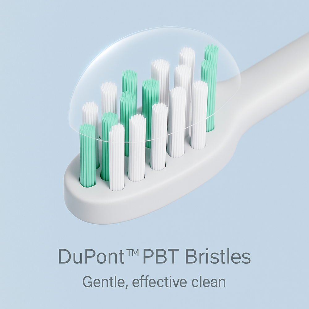 Our toothbrushes use soft DuPont™ PBT bristles designed to clean effectively while remaining gentle on enamel and gums.