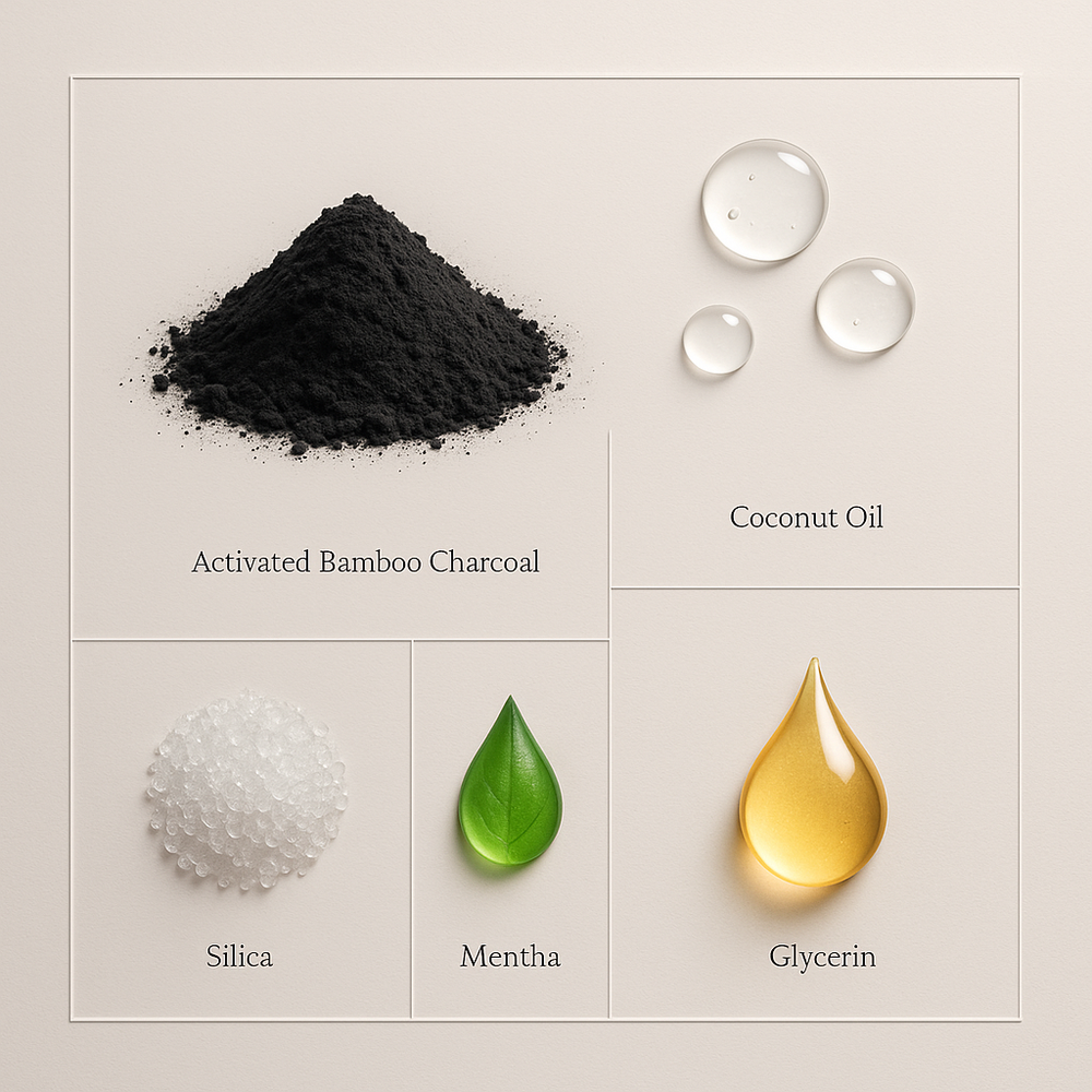 Each ingredient is selected for purity and purpose. Activated bamboo charcoal draws out surface stains, while coconut oil, silica, mentha, and glycerin work together to polish, refresh, and balance. A refined blend that cleanses without compromise.
